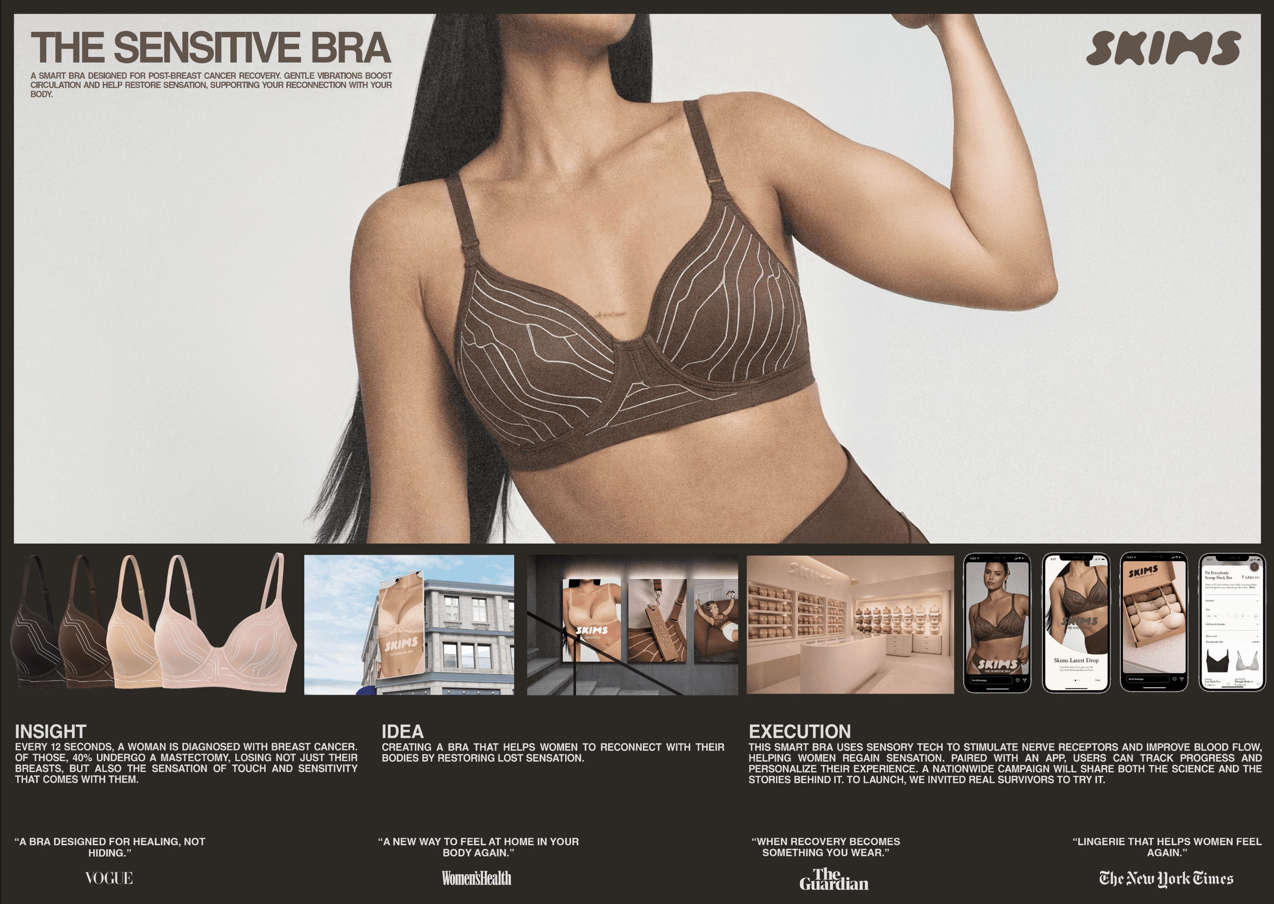Using sensory technology and an app to track progress, this smart bra stimulates nerve endings and improves blood flow. Launched with real survivors and a nationwide campaign, it brings both science and emotion to the forefront.